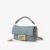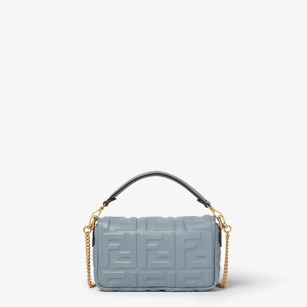 The iconic Baguette® Mini in soft mercury blue calfskin with embossed FF motif. This compact essential features a magnetic clasp, fabric-lined interior with pocket, and versatile carrying options, hand, shoulder, or cross-body. Holds smartphone, cards, keys and essentials. Made in Italy.