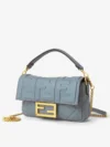 Iconic Mamma Baguette bag in soft mercury blue nappa leather, updated with a deconstructed aesthetic for Spring/Summer 2025. Features the signature FF clasp, magnetic front flap, and spacious suede-lined interior. Versatile styling with detachable shoulder strap and handle for under-the-arm or cross-body wear. Made in Italy with gold-finish metalware.