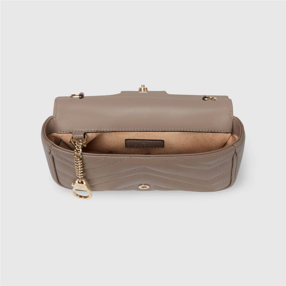 Taupe matelassé chevron leather, Light gold-toned hardware, Microfiber lining with suede-like finish, Attached key ring that can attach to a separate bag, Double G, Chain shoulder strap with 60cm drop, Super mini size: W16.5cm x H10cm x D4.5cm, Made in Italy